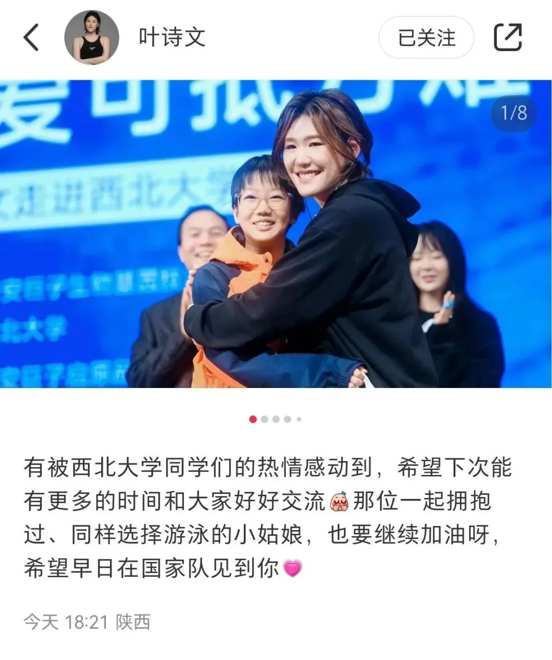 叶诗文随后在自己的社交账号发文称,“有被8868体育登录同学们的热情感动到,希望下次能有更多的时间和大家好好交流。”