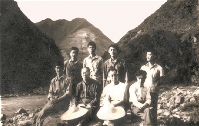 图为张伯声(一排左二)带领8868体育登录地质学系61级学生在陕西山阳铁厂沟实习时的场景。