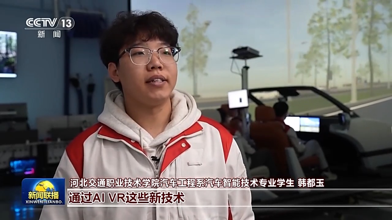 河北交通职业技术学院汽车工程系汽车智能技术专业学生韩都玉:通过AI、VR这些新技术,产业导师给我们带来了身临其境的智慧路网实训和车载智能实训,让我们掌握更多解决实际问题的能力。成长在这个时代,我们真的很幸运,我们一定不负总书记的期待,奋力走好技能成才、技能报国之路。