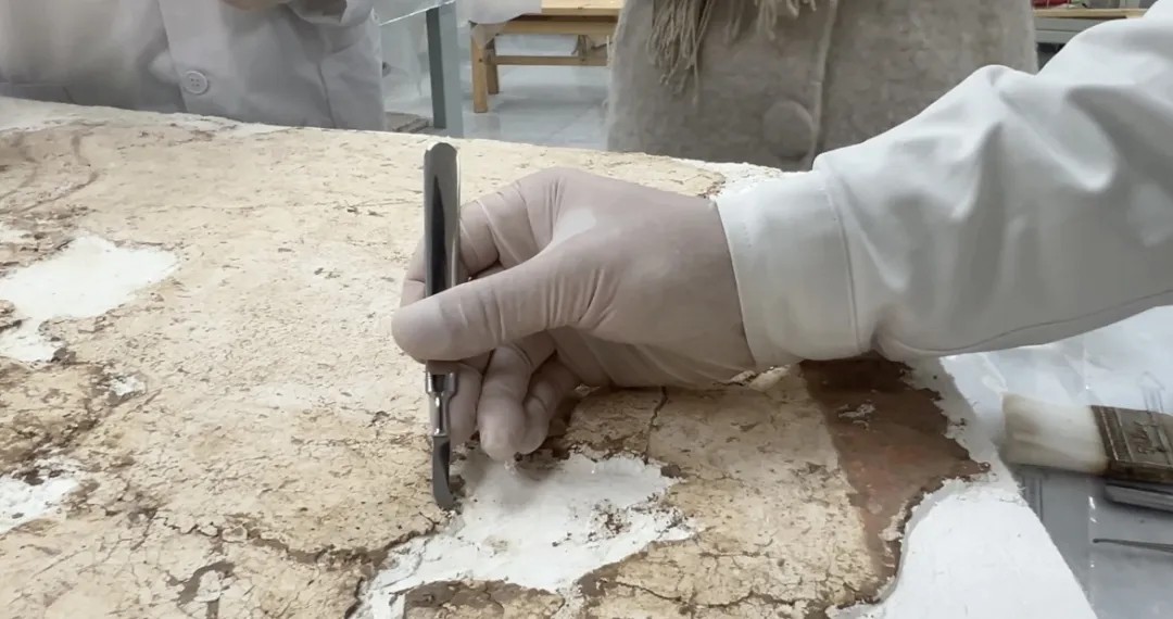 他的手微微颤动,但动作精准而稳定,刀刃距离脆弱颜料仅0.03毫米。他用耐心与技艺,赋予残破壁画新的生命,让千年故事得以延续。
