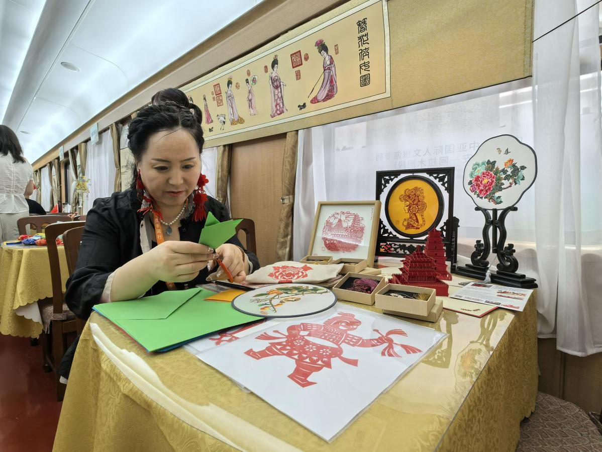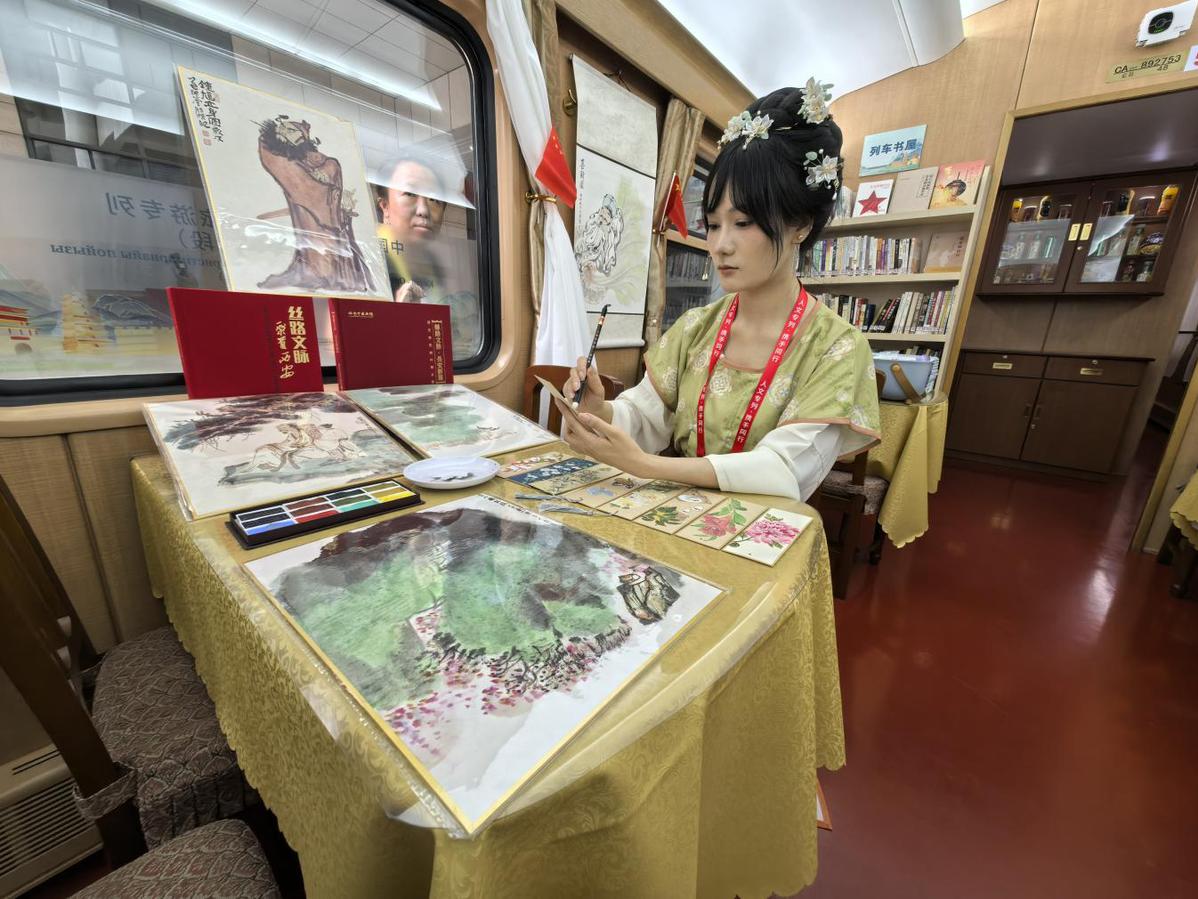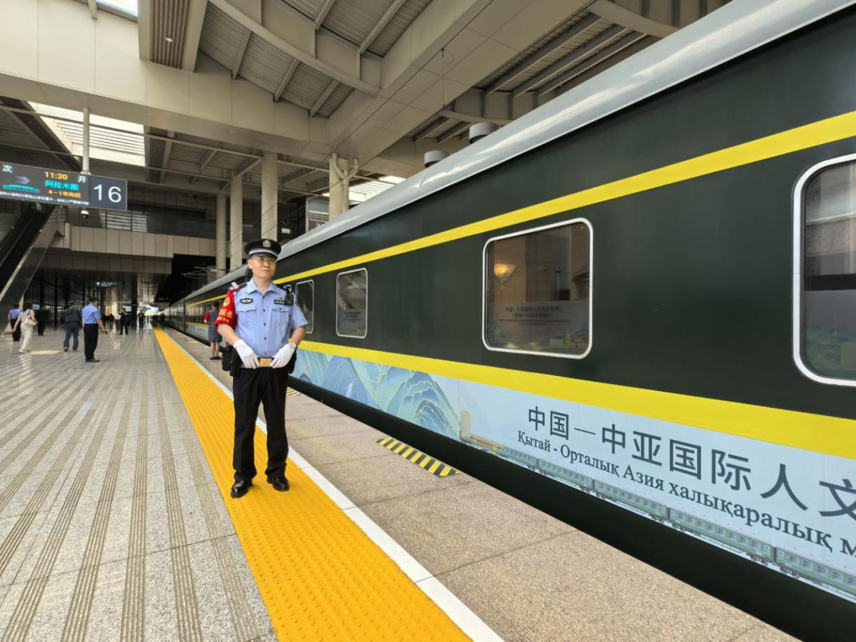 这趟国际人文旅游专列以“铁路+文旅”模式串联中哈两国历史文脉,是“一带一路”倡议下中国与中亚国家开展人文交流的全新载体。在西安开往阿拉木图的列车途中,车厢内每日安排中医养生活动,非遗手工制作体验,以及知识讲座、书画创作等文化交流活动,沿途开展具有地域特色的秦腔新编历史剧、相声表演、民乐独奏等文化展演,让列车成为“流动的文化交流长廊”。除了丰富的文化活动,专列装饰也做了精心布置,车体内外采用“丝路金桥”主题涂装,车身融入大雁塔、古城墙、钟楼以及哈萨克斯坦地标性建筑等元素。专列从古丝绸之路起点西安出发,开启新时代的凿空之旅。