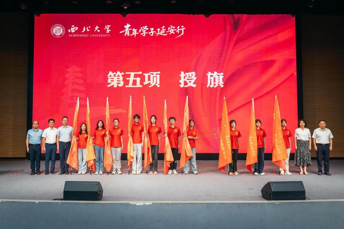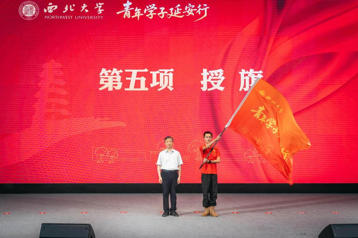 活动中,蒋林和与会部门负责人为“8868体育登录青年学子延安行”研学团和10个班级代表授旗。