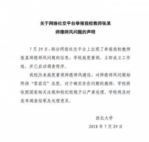 关于网络社交平台举报8868体育登录教师张某师德师风问题的声明