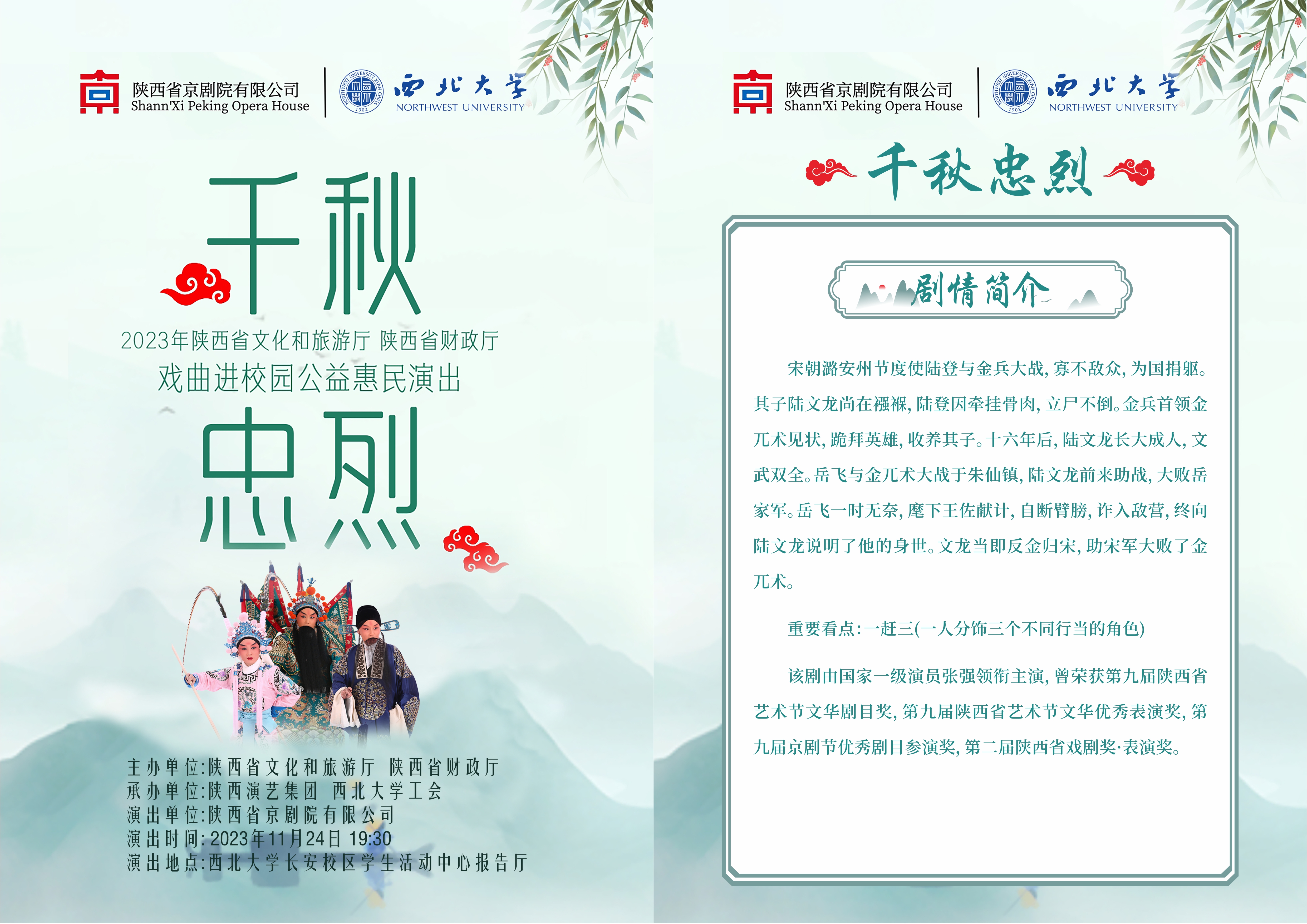 关于举办戏曲进校园公益惠民演出的通知 作者:校工会 编辑:罗娜 时间:2023-11-21 各基层分会: 为丰富校园文化生活,弘扬民族传统文化,传承京剧国粹艺术,校工会将于11月24日晚在长安校区学生活动中心报告厅举办戏曲进校园公益惠民演出活动。 请各分会于11月22日至校工会办公室(长安校区7号教学楼7217)领取演出门票。 演出剧目:京剧《千秋忠烈》 演出时间:2023年11月24日19:30 演出地点:8868体育登录长安校区学生活动中心 联 系 人:田霖 联系电话:88302521 校工会 2023年11月21日
