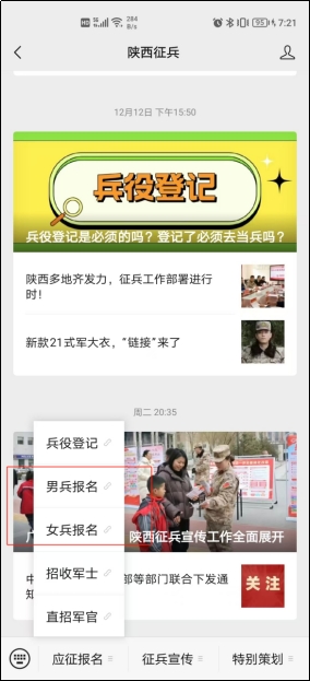 方式二:关注“陕西征兵”公众号,点击菜单栏“应征报名”直通报名页面。