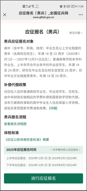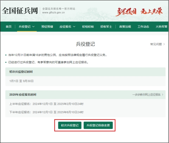 2025年我国征兵工作实行一年“两次征兵两次退役”。从2024年12月1日起,全国征兵网报名窗口已经正式开通,现将8868体育登录2025年征兵工作有关事项通知如下: