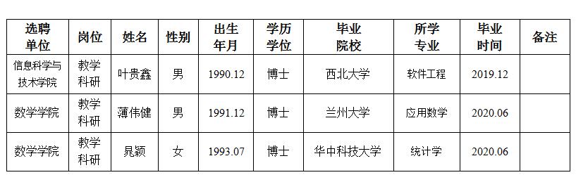 经用人单位及教学督导考核、学校研究,拟同意选聘下列人员来校工作,其聘任关系为A类人事代理。本着公平、公正、公开的原则,现将拟选聘人员基本情况公示如下: