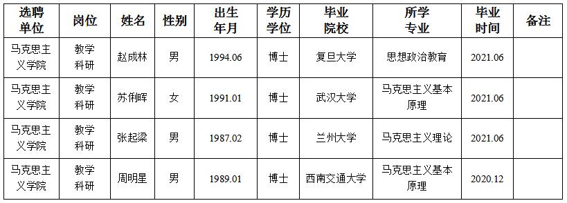 经用人单位及教学督导考核、学校研究,拟同意选聘下列人员来校工作,其聘任关系为A类人事代理。本着公平、公正、公开的原则,现将拟选聘人员基本情况公示如下: