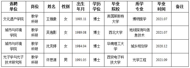 经用人单位及教学督导考核、学校研究,拟同意选聘下列人员来校工作,其聘任关系为A类人事代理。本着公平、公正、公开的原则,现将拟选聘人员基本情况公示如下: