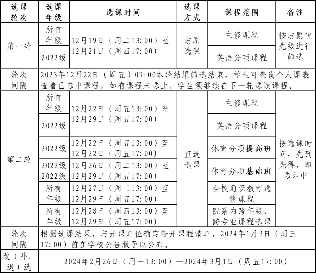 2023—2024学年第二学期课程选课分为正选和改(补、退)选。正选在12月19日(13:00)—12月29日(17:00)进行,分为两轮。改(补、退)选在2024年2月26日(13:00)—2024年3月1日(17:00)进行。现将具体事宜安排如下: