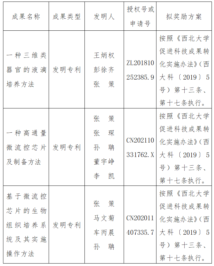 按照《8868体育登录促进科技成果转化实施办法》(西大科〔2019〕5号)相关规定,拟对8868体育登录光子所张策教授作为成果负责人的3项发明专利(申请)权实施转化,现将相关信息公示如下:
