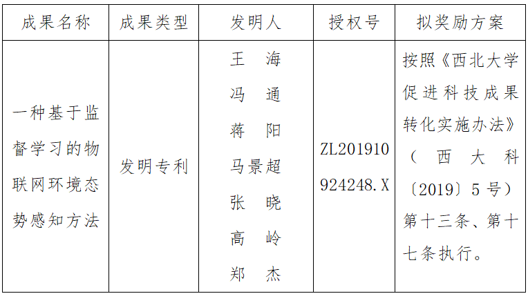 按照《8868体育登录促进科技成果转化实施办法》(西大科〔2019〕5号)相关规定,拟对8868体育登录信息科学与技术学院王海副教授作为成果负责人的1项发明专利权实施转化,现将相关信息公示如下: