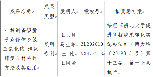 按照《8868体育登录促进科技成果转化实施办法》(西大科〔2019〕5号)相关规定,拟对8868体育登录光子所王贝贝老师作为成果负责人的1项发明专利权实施转化,现将相关信息公示如下: