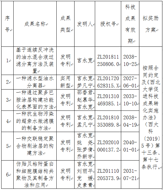 根据《8868体育登录促进科技成果转化实施办法》(西大科〔2019〕5号)相关规定,经学校科技成果转化工作小组、校长办公会审议,校党委常委会审定,拟对8868体育登录化材学院宫永宽教授作为成果负责人的6项专利(5项发明专利和1项实用新型专利)权实施独占许可,现将相关信息公示如下: