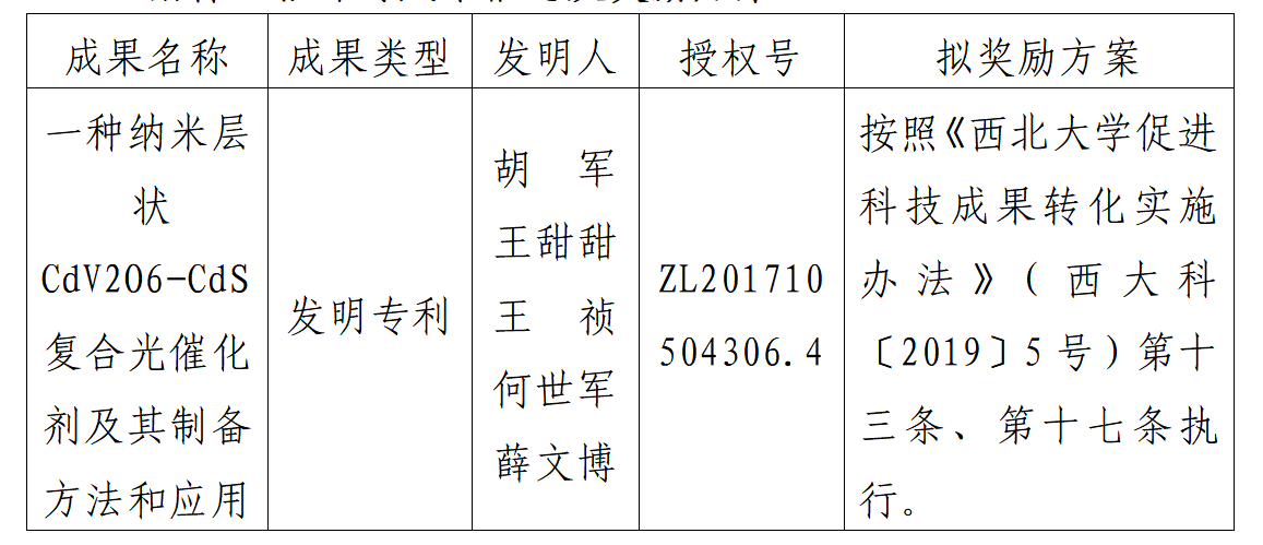 按照《8868体育登录促进科技成果转化实施办法》(西大科〔2019〕5号)相关规定,拟对8868体育登录化工学院胡军教授作为成果负责人的1项发明专利权实施转化,现将相关信息公示如下: