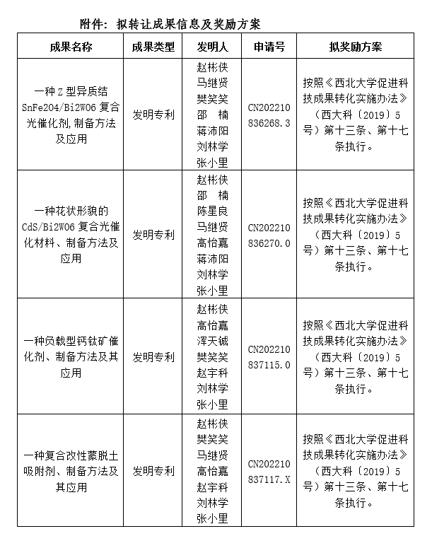 按照《8868体育登录促进科技成果转化实施办法》(西大科〔2019〕5号)相关规定,拟对8868体育登录化工学院赵彬侠教授作为成果负责人的4项专利申请权实施转化,现将相关信息公示如下: