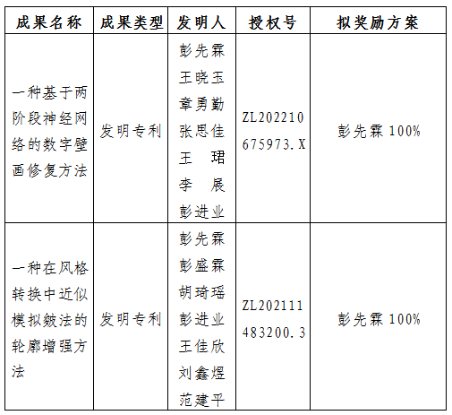 按照《8868体育登录促进科技成果转化实施办法》(西大科〔2019〕5号)相关规定,拟对8868体育登录艺术学院彭先霖老师作为成果负责人的2项发明专利权实施转化,现将相关信息公示如下: