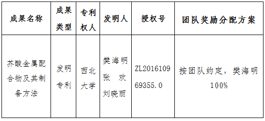 按照《8868体育登录促进科技成果转化实施办法》(西大科〔2019〕5号)相关规定,经科技成果转化工作小组审议,校长办公会审定通过,拟对8868体育登录化学与材料科学学院樊海明教授作为成果负责人的1项发明专利权实施以作价入股结合现金支付方式转让,现将相关信息公示如下: