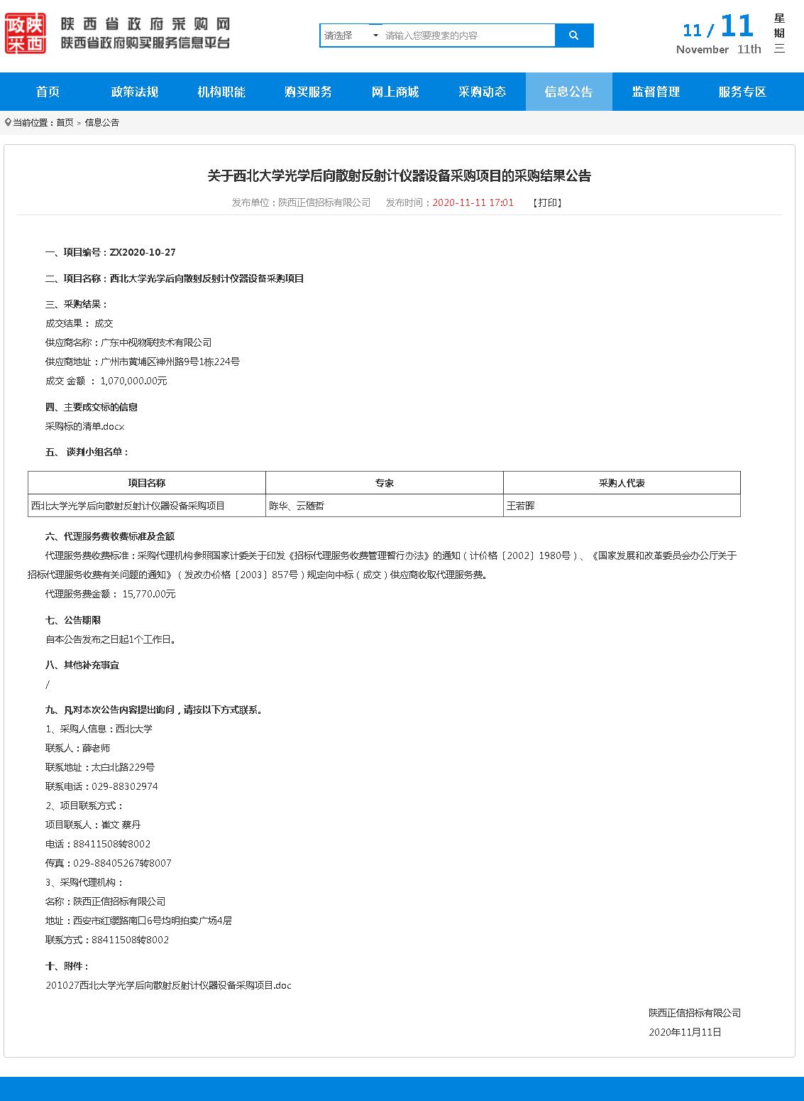 关于8868体育登录光学后向散射反射计仪器设备采购项目的采购结果公告