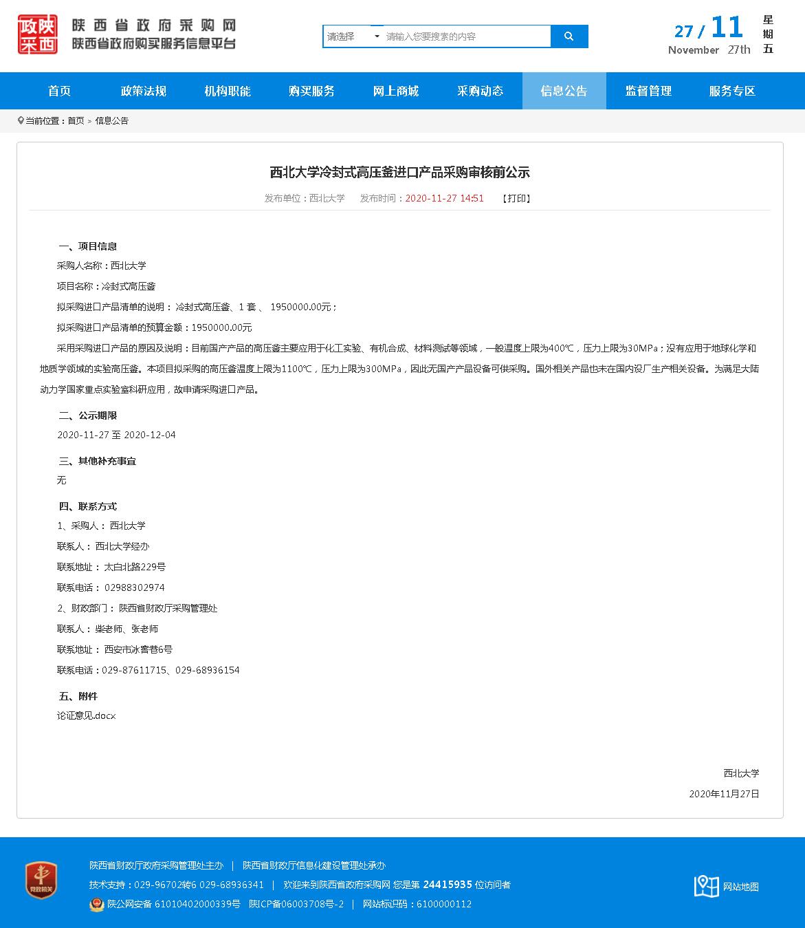 8868体育登录冷封式高压釜进口产品采购审核前公示