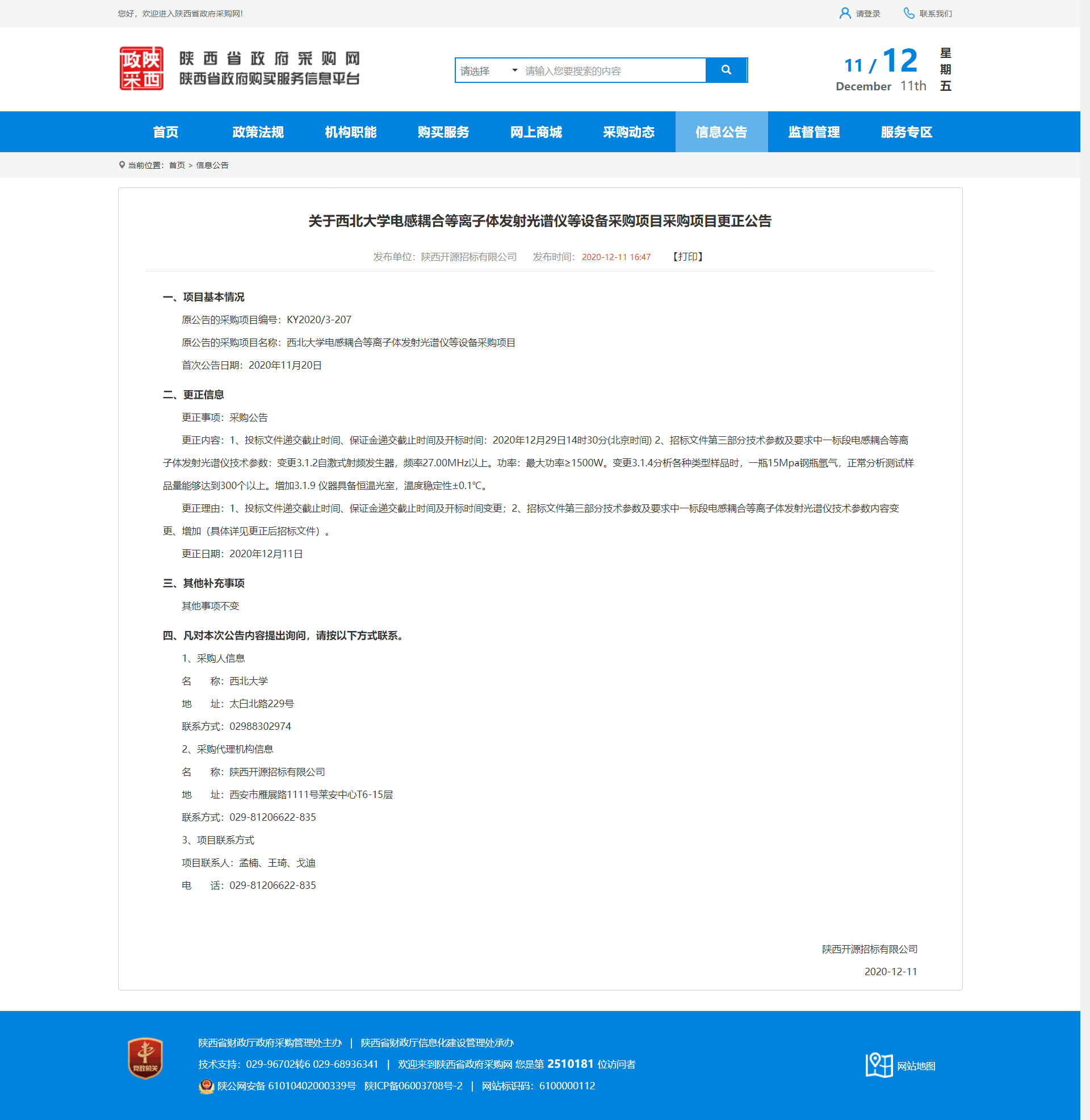 关于8868体育登录电感耦合等离子体发射光谱仪等设备采购项目采购项目更正公告 作者: 编辑:薛利娟 时间:2020-12-11 原公告地址:http://www.ccgp-shaanxi.gov.cn/notice/noticeDetail.do?noticeguid=8a85be3375d5d589017650e8e44672f0