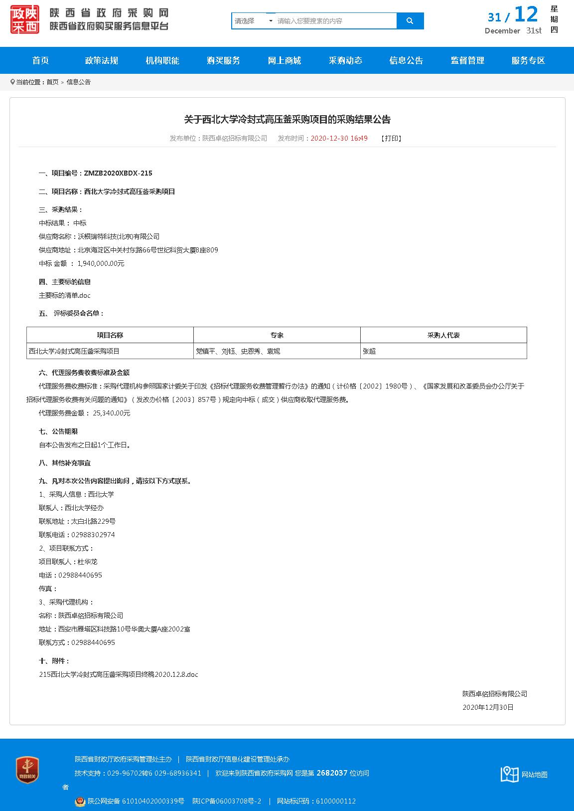 8868体育登录冷封式高压釜采购项目的采购结果公告
