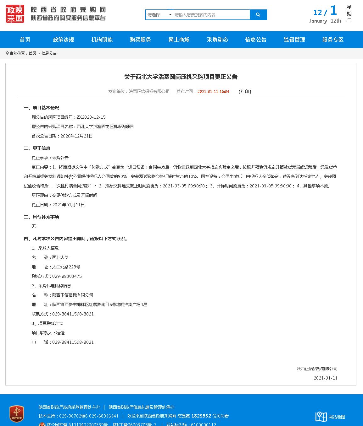 8868体育登录活塞圆筒压机采购项目更正公告