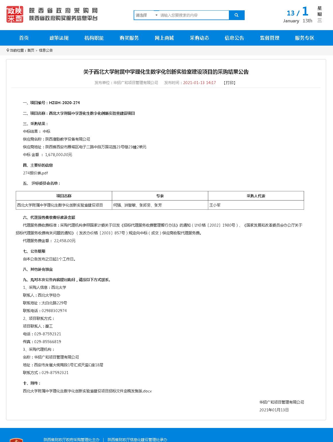关于8868体育登录附属中学理化生数字化创新实验室建设项目的采购结果公告