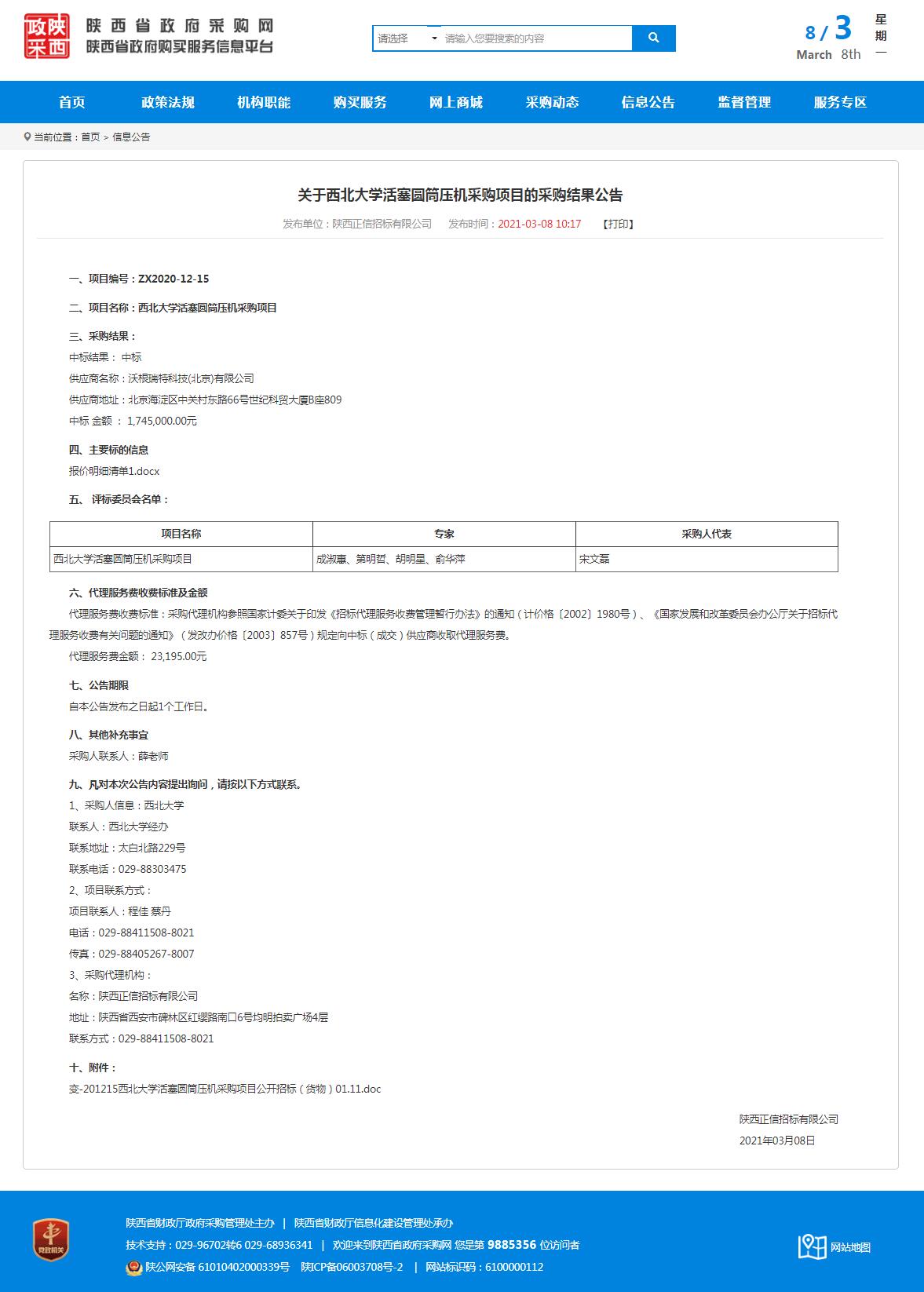 8868体育登录活塞圆筒压机采购项目的采购结果公告