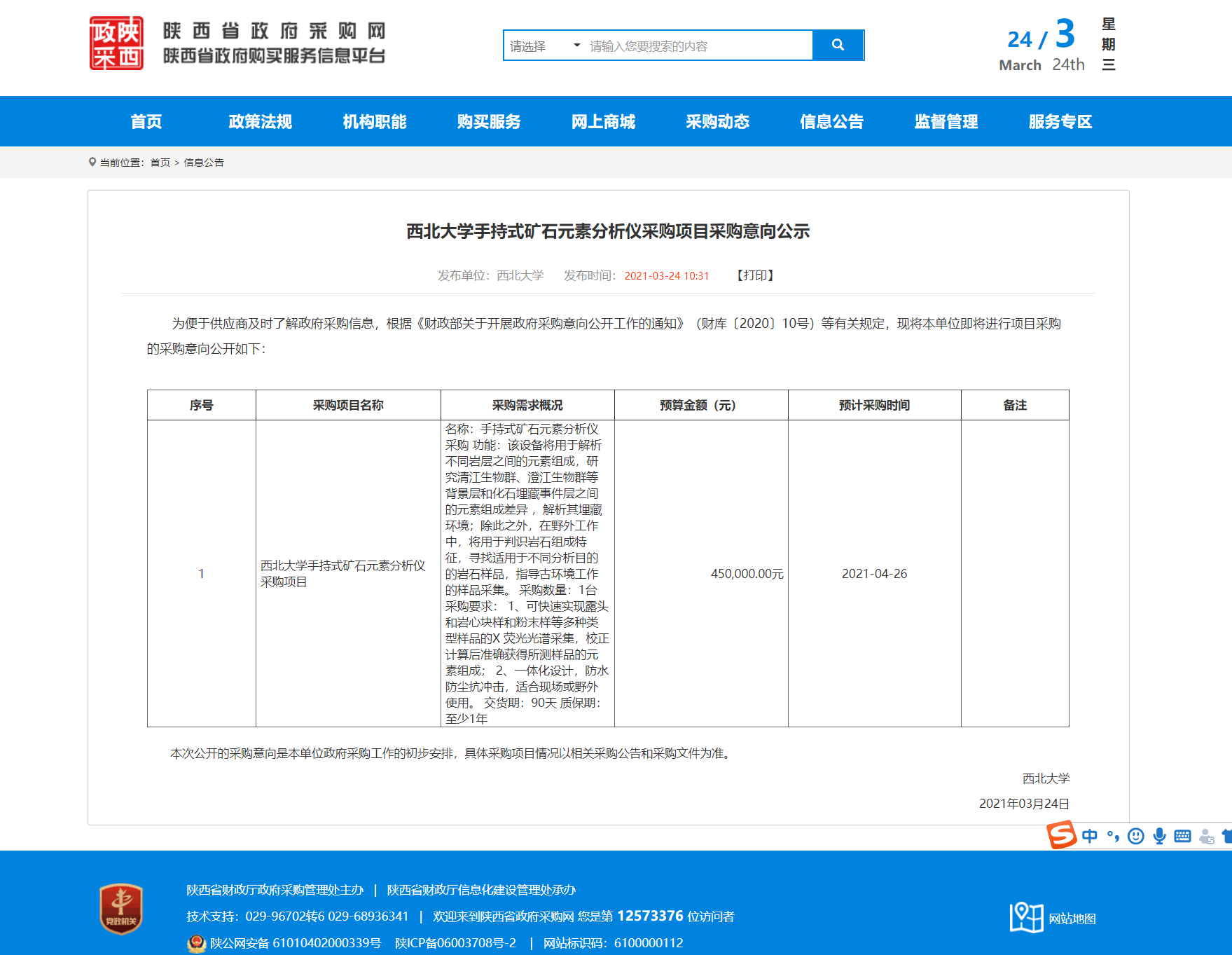 8868体育登录手持式矿石元素分析仪采购项目采购意向公示