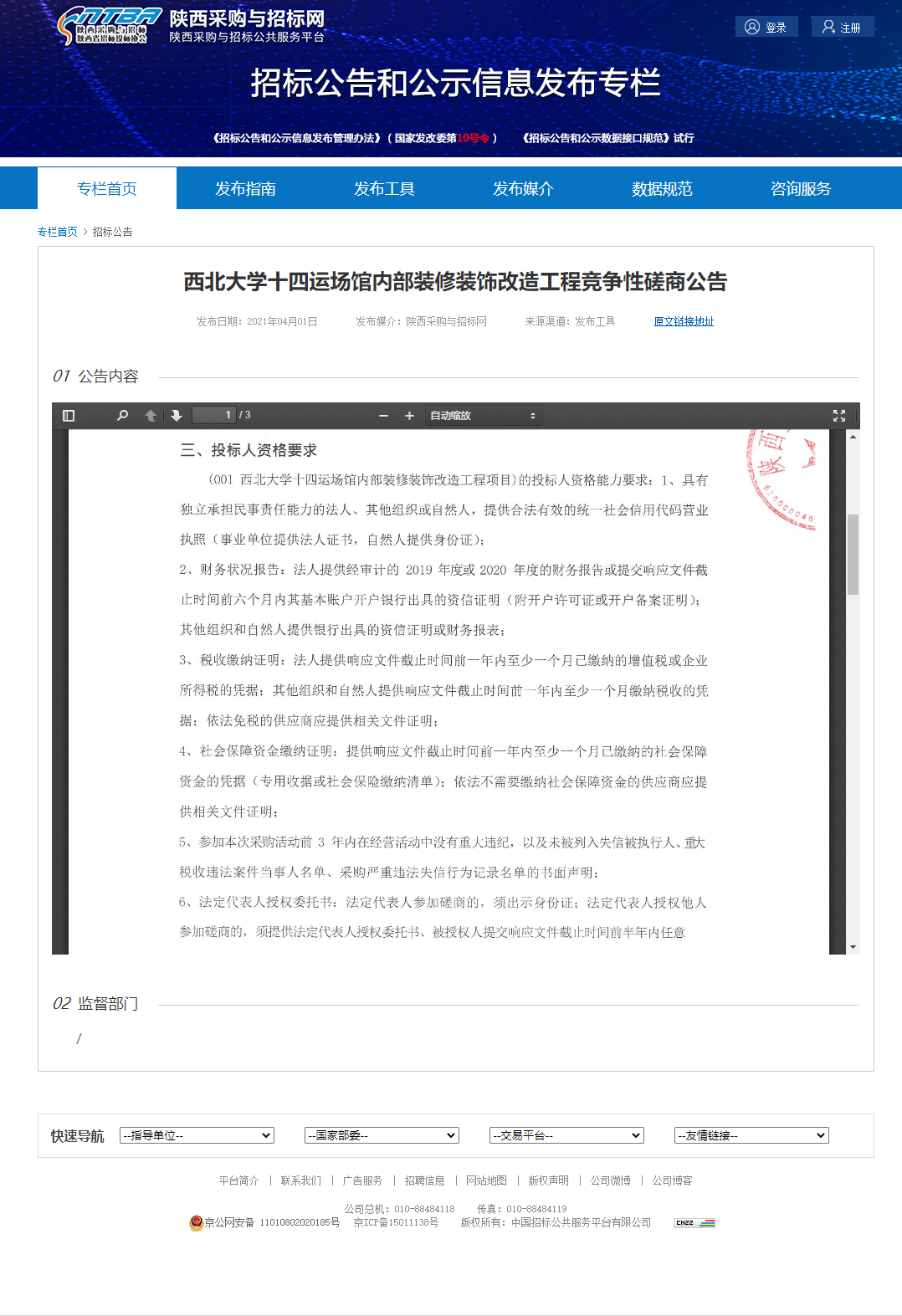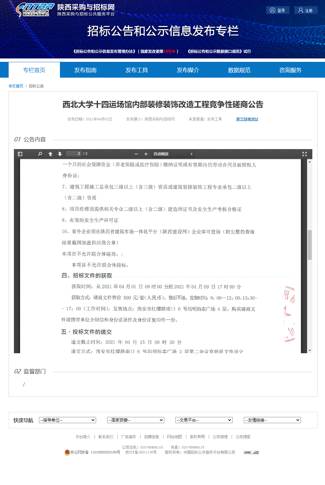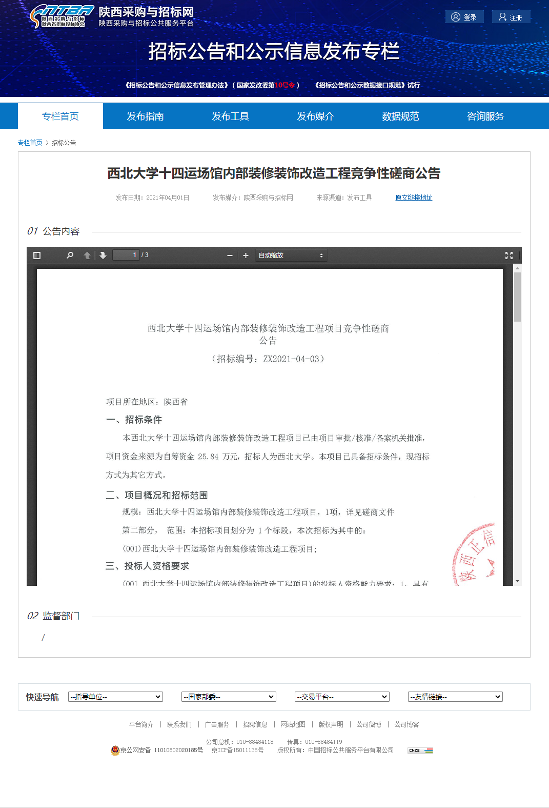 8868体育登录十四运场馆内部装修装饰改造工程竞争性磋商公告 作者: 编辑:薛利娟 时间:2021-04-02 原公告链接地址:http://bulletin.sntba.com/biddingBulletin/2021-04-01/283967.html