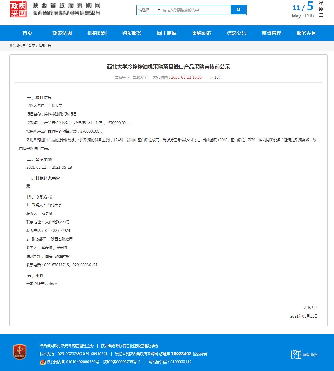 8868体育登录冷榨榨油机采购项目进口产品采购审核前公示