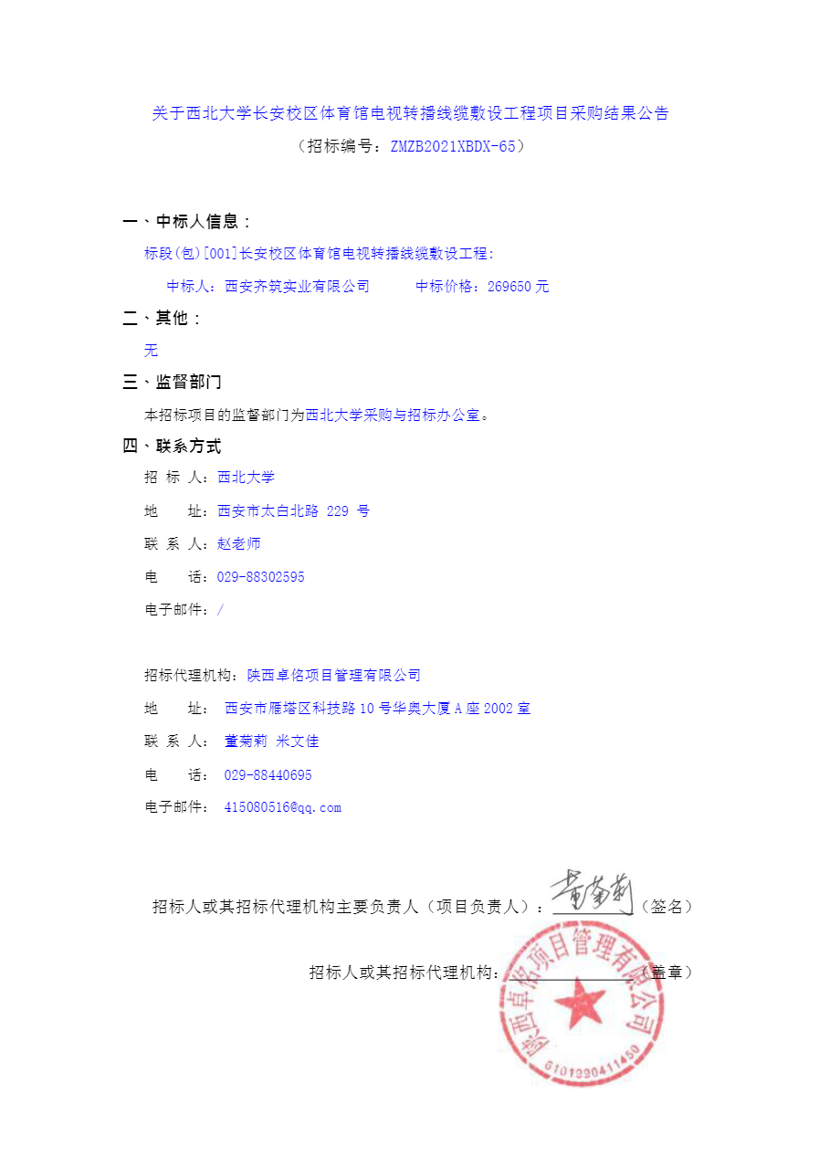 关于8868体育登录长安校区体育馆电视转播线缆敷设工程项目采购结果公告