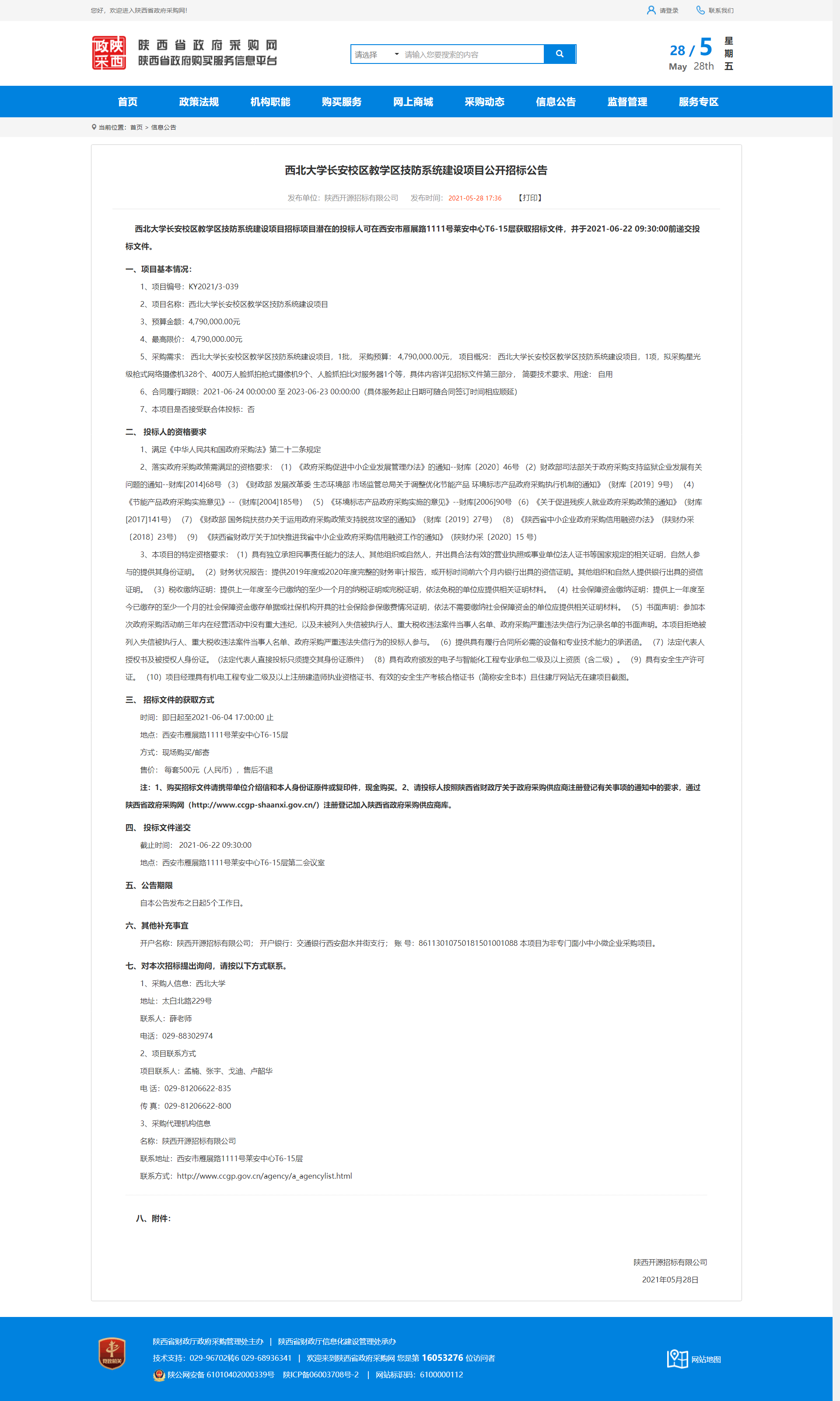 8868体育登录长安校区教学区技防系统建设项目公开招标公告 作者: 编辑:薛利娟 时间:2021-05-28 原公告地址:http://www.ccgp-shaanxi.gov.cn/notice/noticeDetail.do?noticeguid=8a85be3478a597990179b2102a6f761a