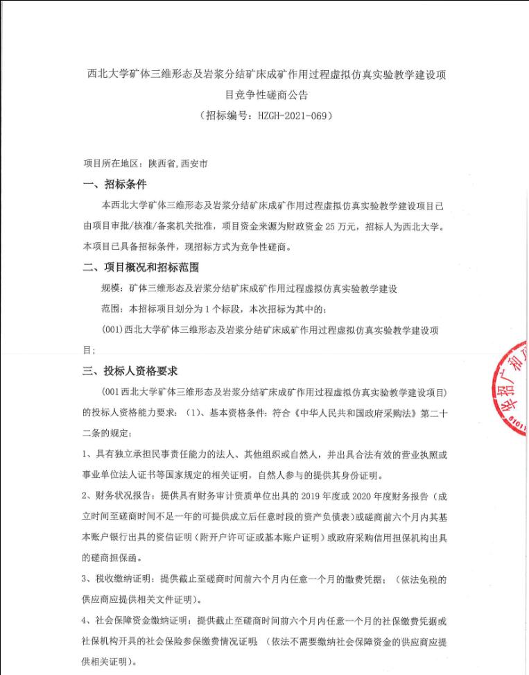 8868体育登录矿体三维形态及岩浆分结矿床成矿作用过程虚拟仿真实验教学建设项目竞争性磋商公告