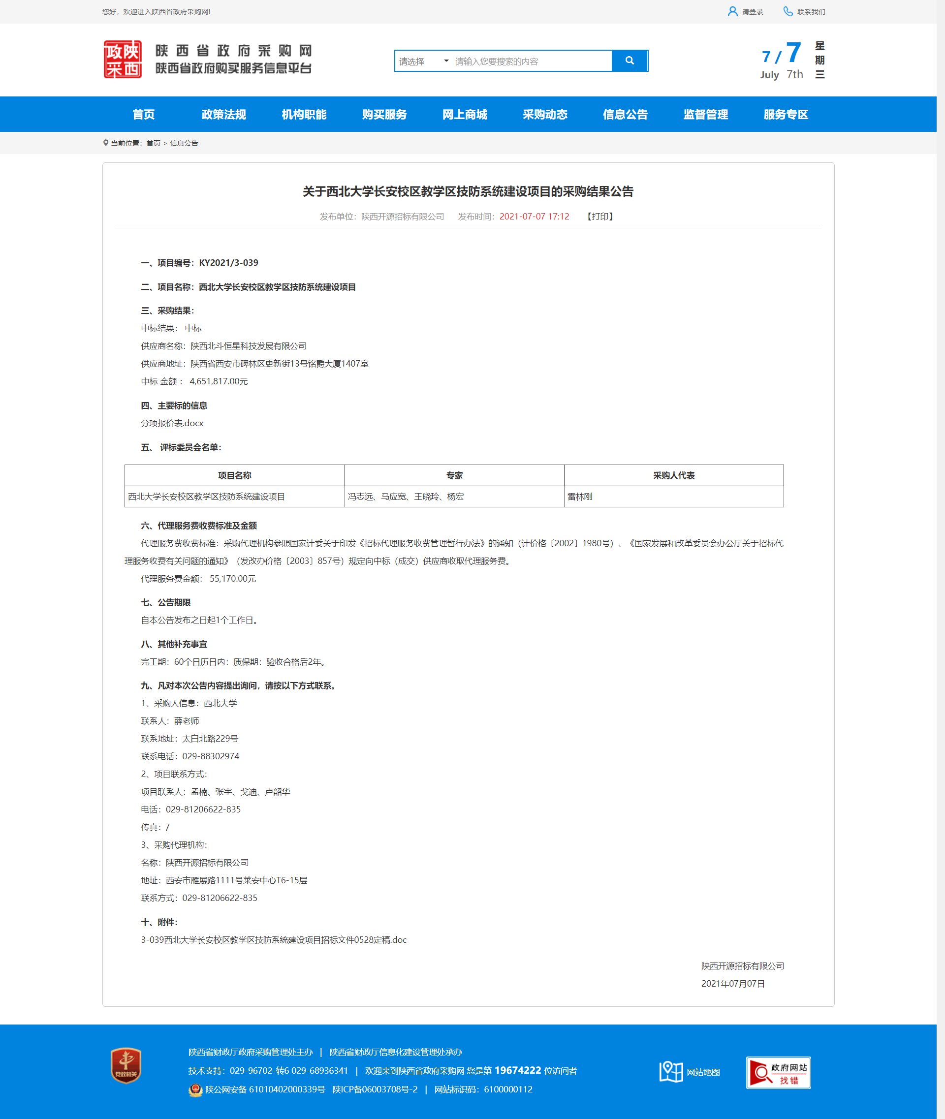 关于8868体育登录长安校区教学区技防系统建设项目的采购结果公告 作者: 编辑:采购与招标办公室 时间:2021-07-07 原公告地址:http://www.ccgp-shaanxi.gov.cn/notice/noticeDetail.do?noticeguid=8a85be337a79620e017a7fff10cb41ef