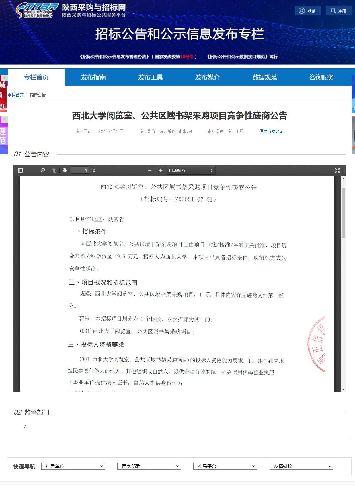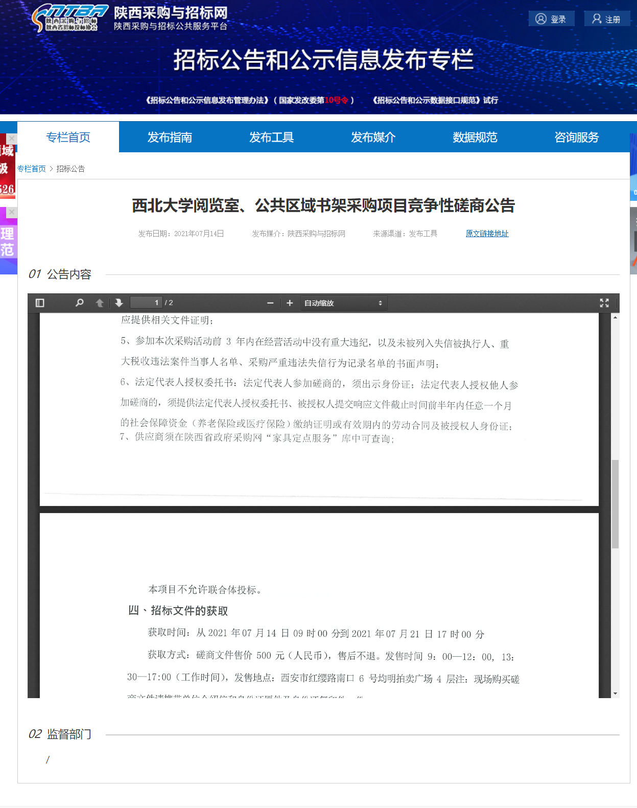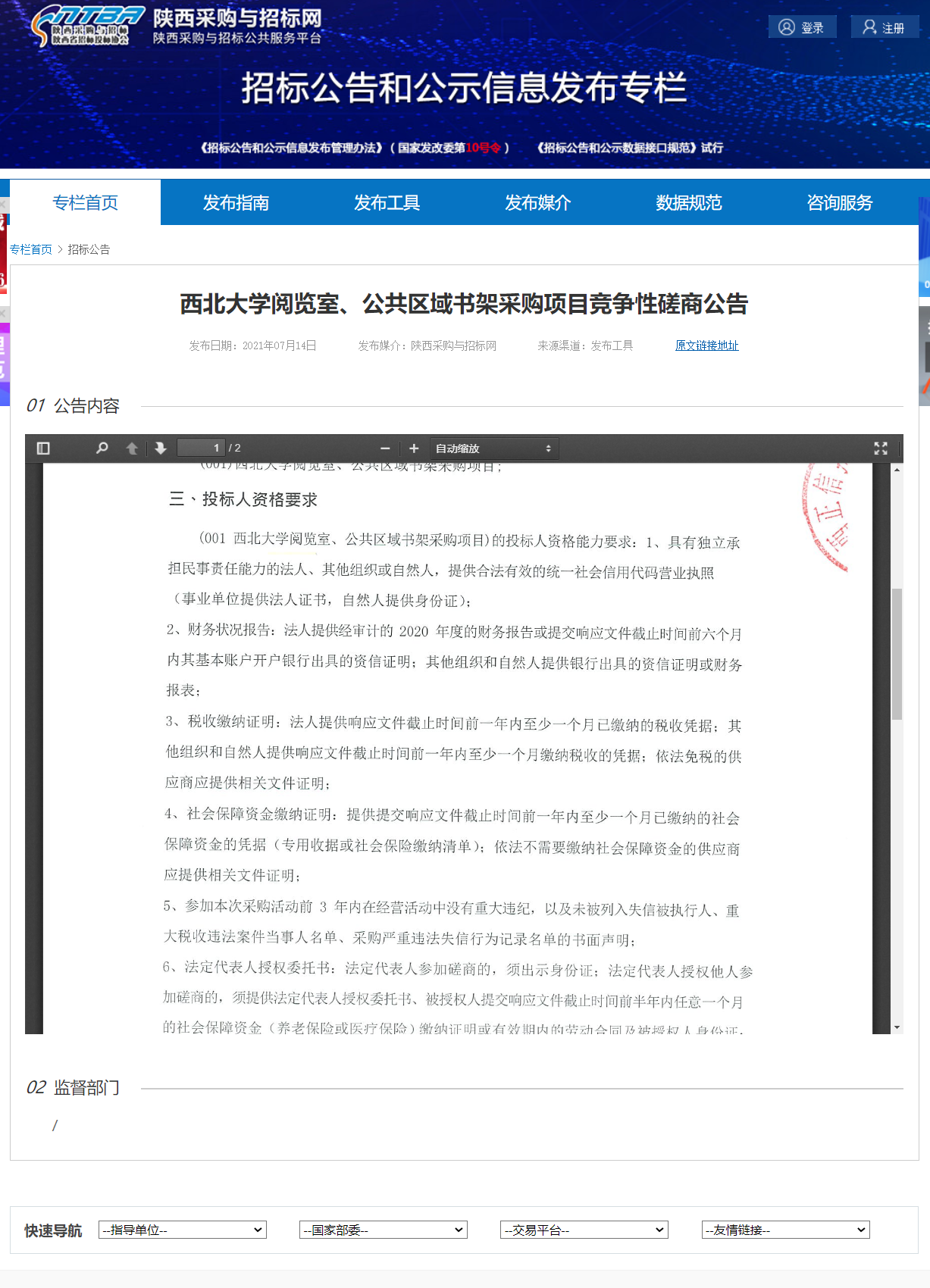 8868体育登录阅览室、公共区域书架采购项目竞争性磋商公告 作者: 编辑:采购与招标办公室 时间:2021-07-15 原公告地址:http://bulletin.sntba.com/biddingBulletin/2021-07-14/318895.html