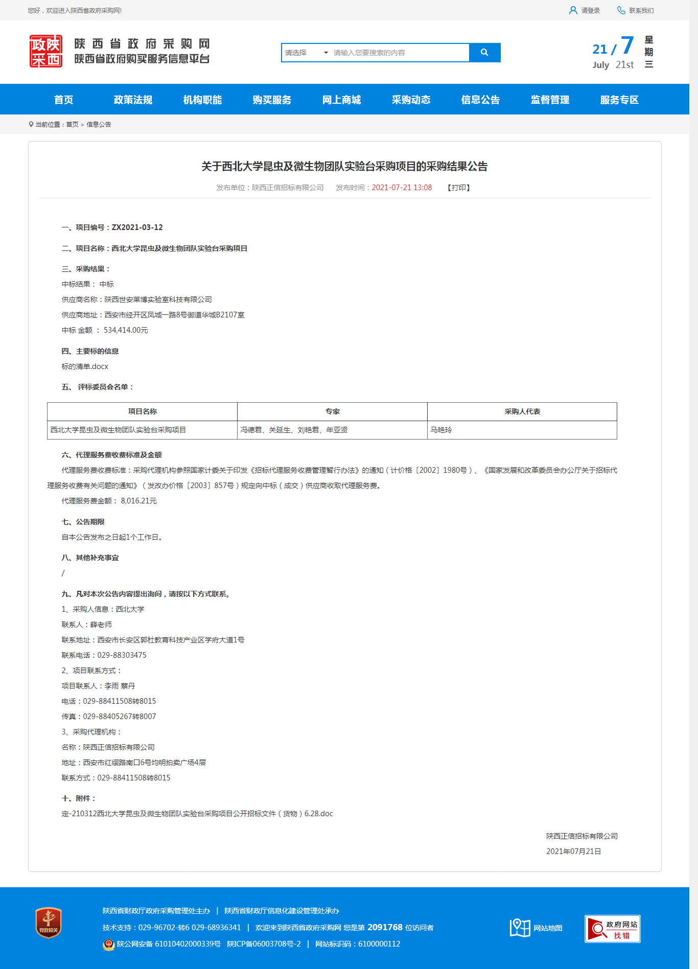 关于8868体育登录昆虫及微生物团队实验台采购项目的采购结果公告 作者: 编辑:采购与招标办公室 时间:2021-07-21 原公告地址:http://www.ccgp-shaanxi.gov.cn/notice/noticeDetail.do?noticeguid=8a85be347a795e58017ac68e08ff1739