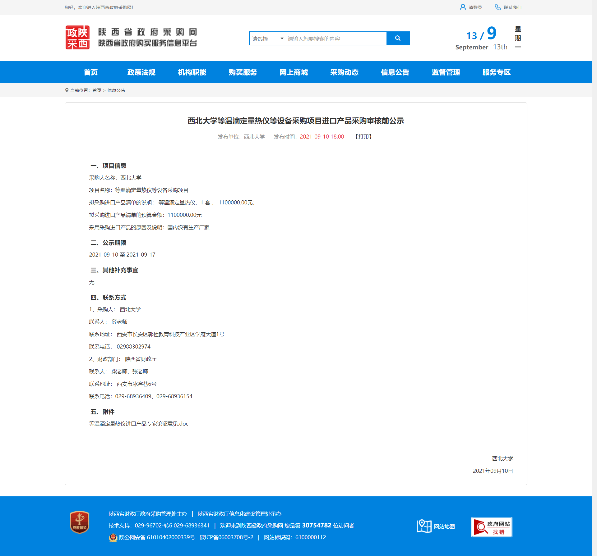 8868体育登录等温滴定量热仪等设备采购项目进口产品采购审核前公示 作者: 编辑:采购与招标办公室 时间:2021-09-13 原公告地址:http://www.ccgp-shaanxi.gov.cn/notice/noticeDetail.do?noticeguid=8a85be347bc00296017bcf17c5ca1019