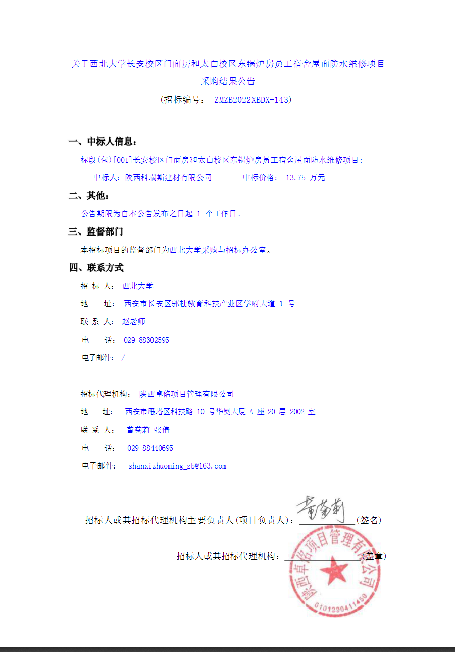关于8868体育登录长安校区门面房和太白校区东锅炉房员工宿舍屋面防水维修项目采购结果公告