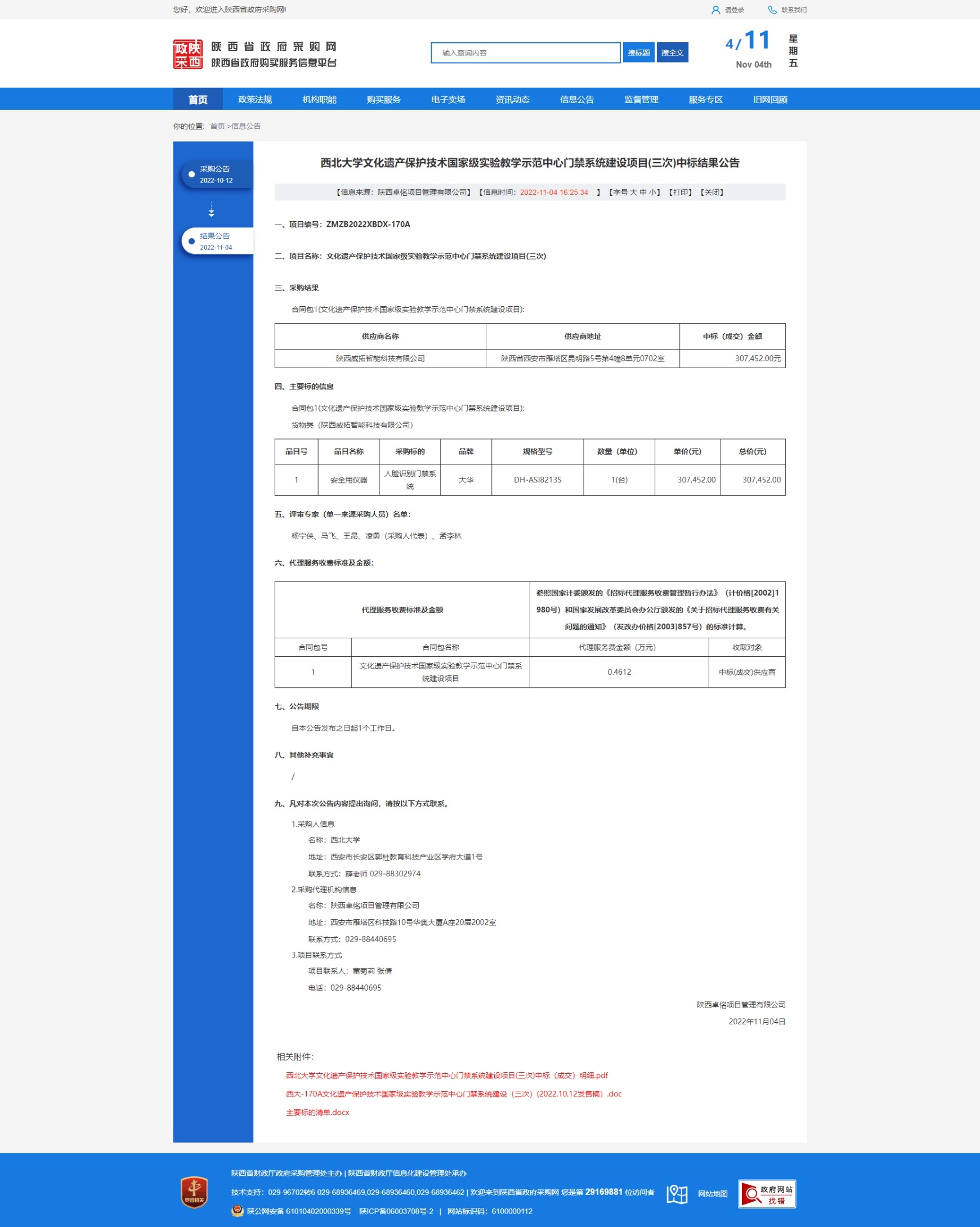 8868体育登录文化遗产保护技术国家级实验教学示范中心门禁系统建设项目(三次)中标结果公告 作者: 编辑:采购与招标办公室 时间:2022-11-04 原公告链接:http://www.ccgp-shaanxi.gov.cn/freecms/site/shaanxi/ggxx/info/2022/8a69c1948405afd90184419c635f2343.html?noticeType=001021¬iceId=de821f62-5c1a-11ed-9a8e-08c0eb20c666