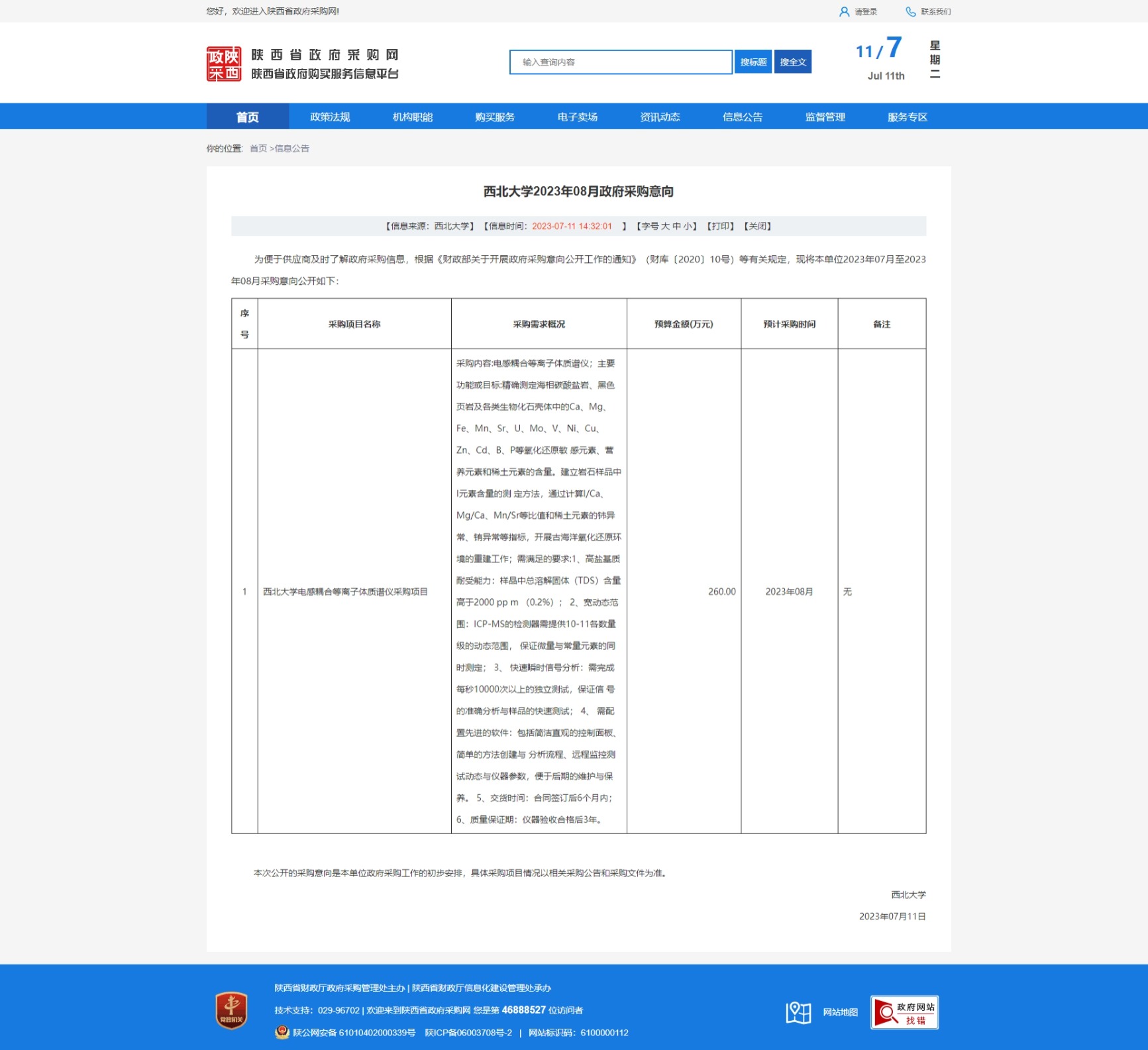 8868体育登录2023年08月政府采购意向 作者: 编辑:采购与招标办公室 时间:2023-07-11 原公告链接:http://www.ccgp-shaanxi.gov.cn/freecms/site/shaanxi/ggxx/info/2023/8a69c1f4893dd1c301893e96750d16d6.html?noticeType=59¬iceId=c1894944-1fb5-11ee-9a8e-08c0eb20c666