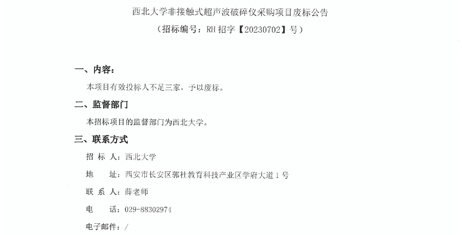 8868体育登录非接触式超声波破碎仪采购项目废标公告 作者: 编辑:采购与招标办公室 时间:2023-09-07 原公告链接:http://bulletin.sntba.com/changeBulletin/2023-09-07/651428.html