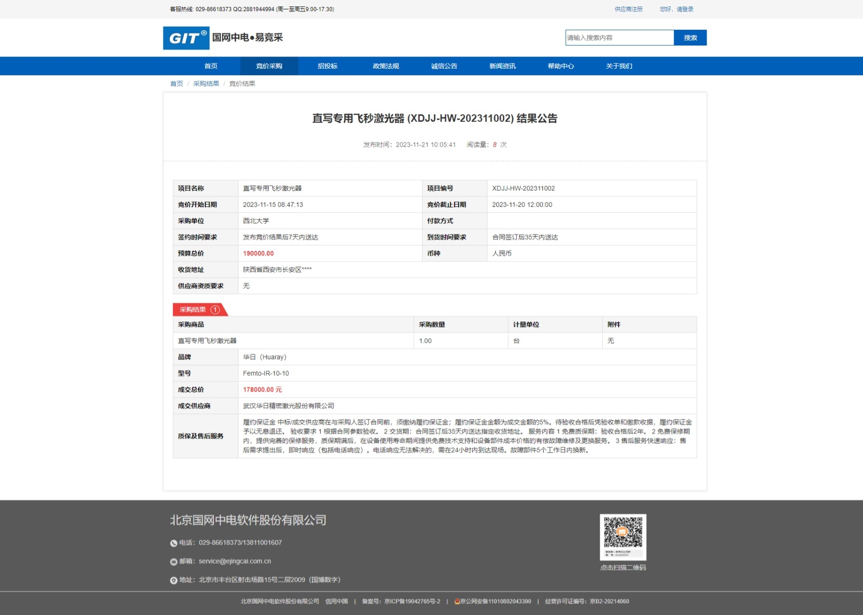 8868体育登录直写专用飞秒激光器采购项目结果公告 作者: 编辑:采购与招标办公室 时间:2023-11-22 原公告链接:https://www.ejingcai.com.cn/site/bidding/detail/6959