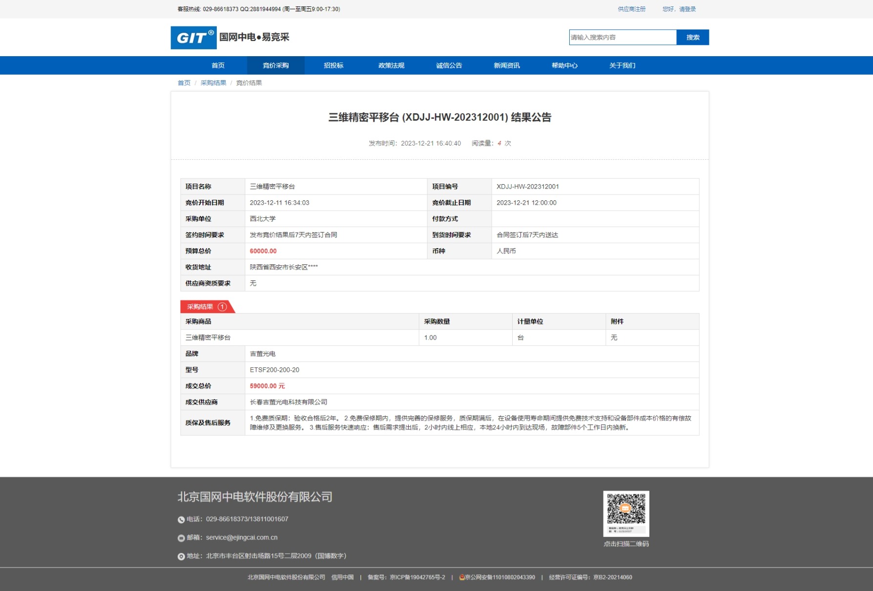 8868体育登录三维精密平移台采购项目 (XDJJ-HW-202312001) 竞价结果公告 作者: 编辑: 时间:2023-12-21 原公告链接:http://www.ejingcai.com.cn/site/bidding/detail/7978