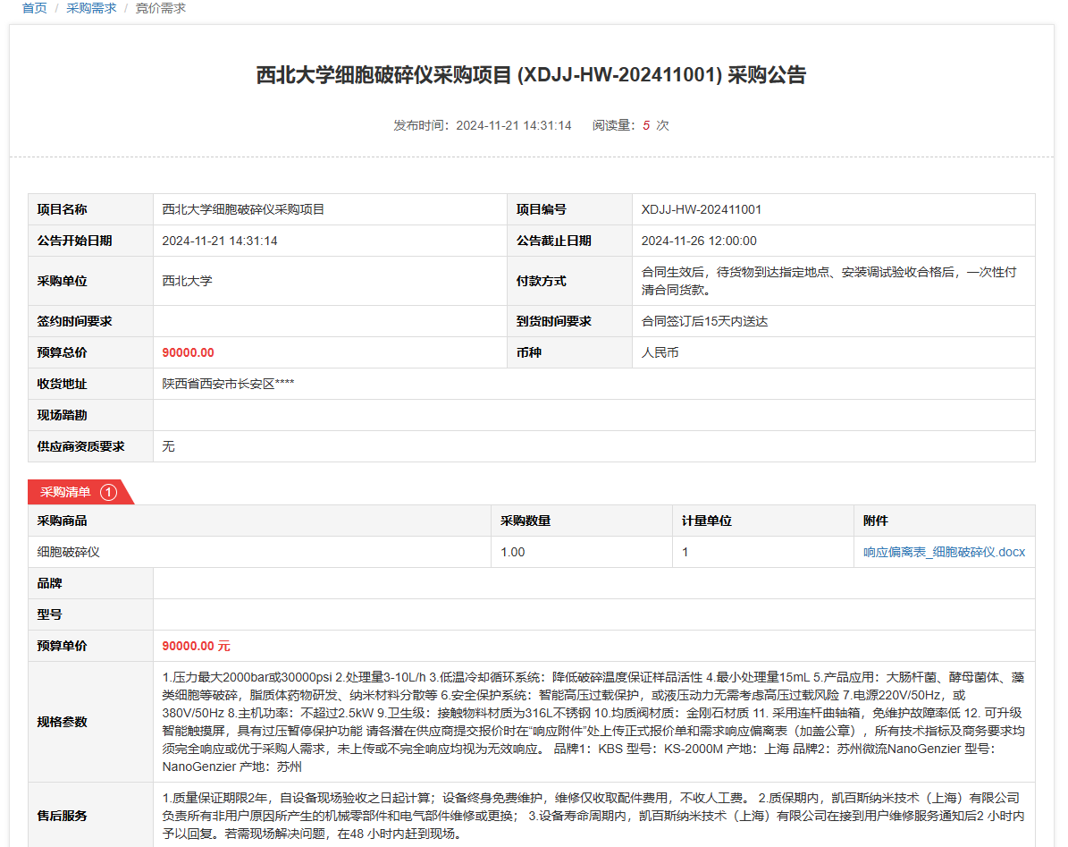 8868体育登录细胞破碎仪采购项目(XDJJ-HW-202411001)竞价采购公告 作者:采购与招标办公室 编辑: 时间:2024-11-21 原公告链接:https://www.ejingcai.com.cn/site/bidding/detail/15200