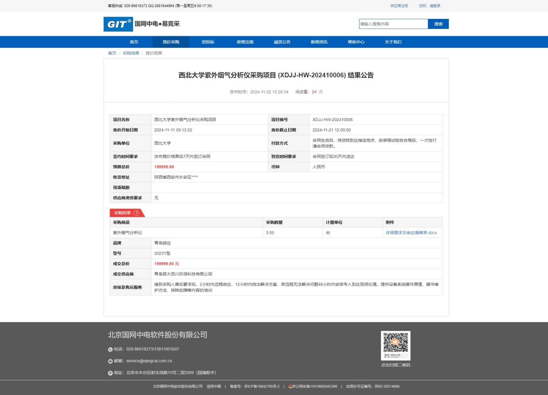 8868体育登录紫外烟气分析仪采购项目 (XDJJ-HW-202410006) 结果公告 作者: 编辑:薛利娟 时间:2024-11-22 原公告链接:https://www.ejingcai.com.cn/site/bidding/detail/15251
