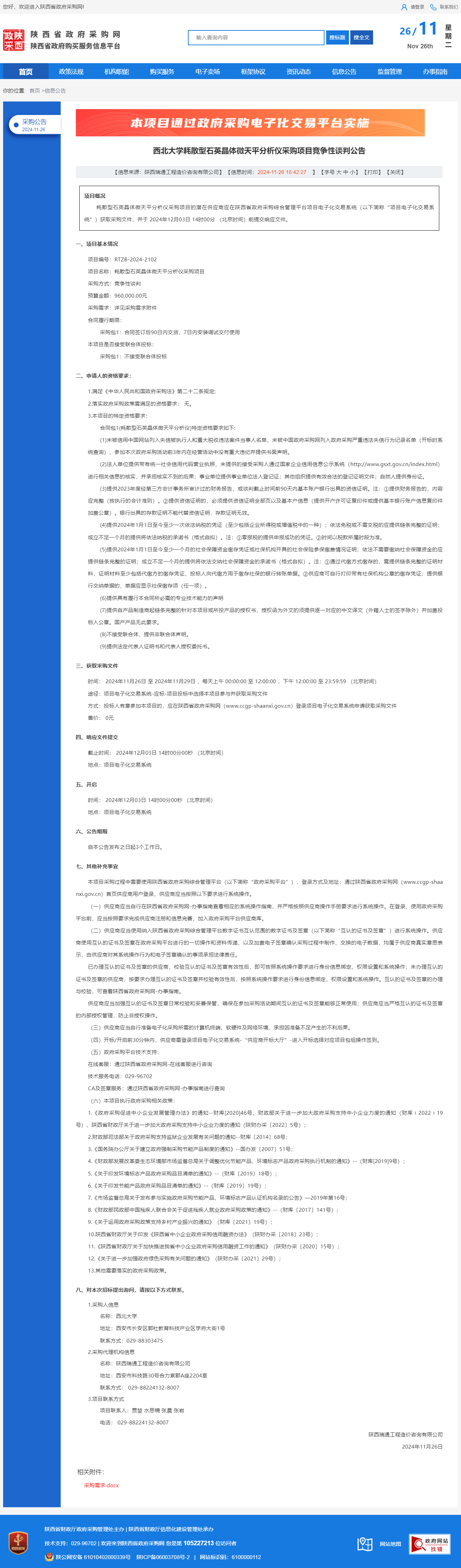 8868体育登录耗散型石英晶体微天平分析仪采购项目竞争性谈判公告 作者:采购与招标办公室 编辑: 时间:2024-11-26 原公告链接:http://www.ccgp-shaanxi.gov.cn/freecms/site/shaanxi/ggxx/info/2024/8a69c251921857370193680865e86269.html?noticeType=001013¬iceId=b80e3459-abe4-11ef-8063-08c0eb20c666