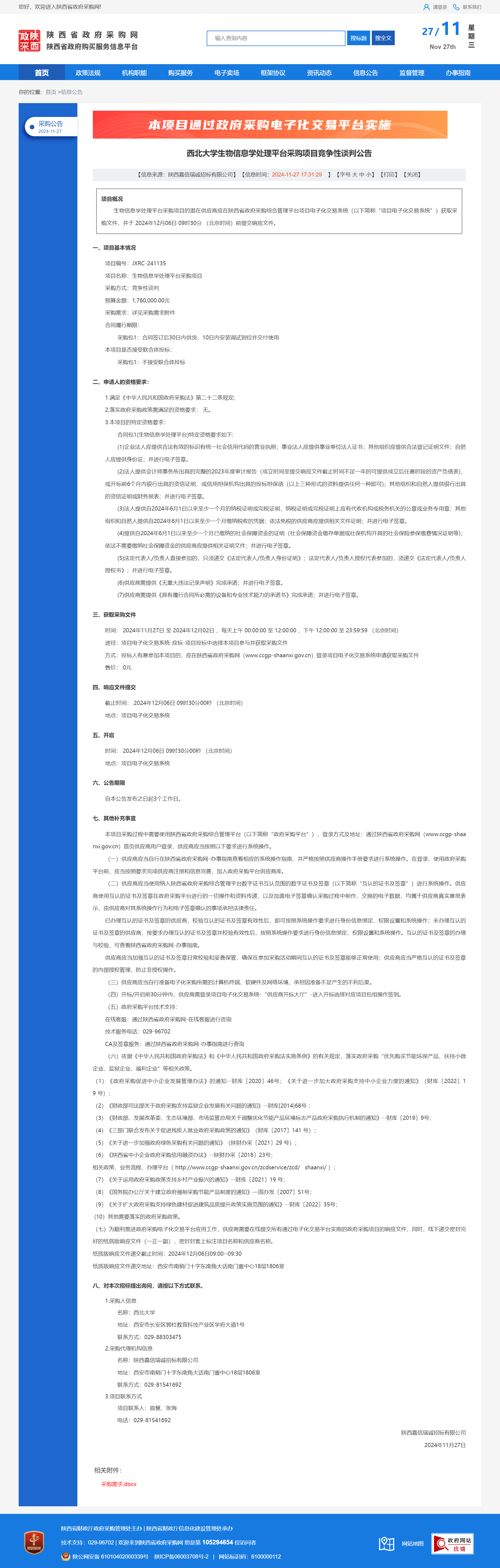 8868体育登录生物信息学处理平台采购项目竞争性谈判公告 作者:采购与招标办公室 编辑: 时间:2024-11-27 原公告链接:https://www.ccgp-shaanxi.gov.cn/freecms/site/shaanxi/ggxx/info/2024/8a69c2519218573701936ce159174448.html?noticeType=001013¬iceId=f93e2324-aca3-11ef-8063-08c0eb20c666