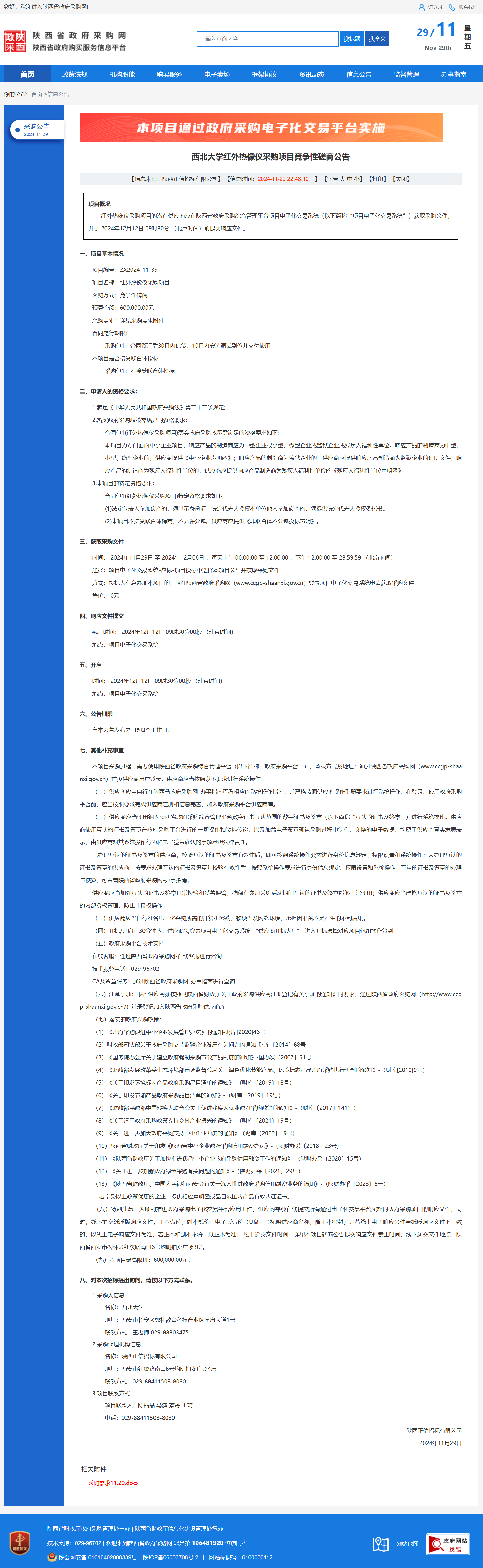 8868体育登录红外热像仪采购项目竞争性磋商公告 作者:采购与招标办公室 编辑: 时间:2024-11-29 原公告链接:http://www.ccgp-shaanxi.gov.cn/freecms/site/shaanxi/ggxx/info/2024/8a69c25192185737019378563f514743.html?noticeType=001016¬iceId=8c82e43c-ae62-11ef-8063-08c0eb20c666